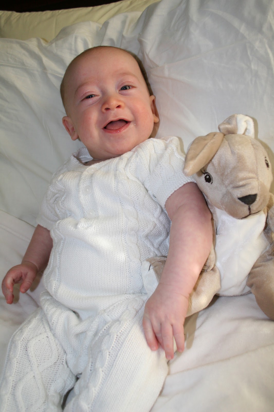 That sweet baby boy is already four months old! Joshua is smiling, cooing, playing, teething(!!), rolling both ways, and holding his head up so well. He also cries more than average, we think, perhaps out of his frustration at not being able to communicate. We'll get there; I'm trying to teach him some baby sign language. Joshua doesn't sleep through the night yet, so I'm exhausted, but he's growing and happy, so we're trying to deal with the interrupted sleep. I'm so thankful that Brad lets me stay home with the baby; it seems like the very best thing for both the baby and me. He's such a good husband and daddy. I love to see him play with Joshie and hold him. :o)